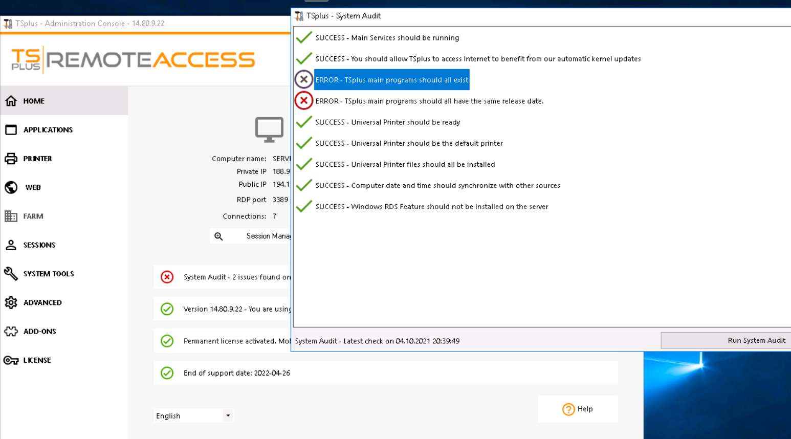 I must apologize. The topic name is out of date. After reinstalling tsplus for the first time, the message "alternateshell file not found" does not appear. There are only these two audit errors. Is it possible to see the audit run more deeply ?