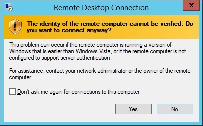 After upgrading to latest Flexi Cloud v 10.40.7.30, when the administrator try to connect via RDP to the servers, he is presented with a message box advising that "The identity of the remote computer cannot be verified ... This problem occur if the remote computer is running a version of Windows that is earlier than Windows Vista, or if the remote computer is not configured to support server authentication".